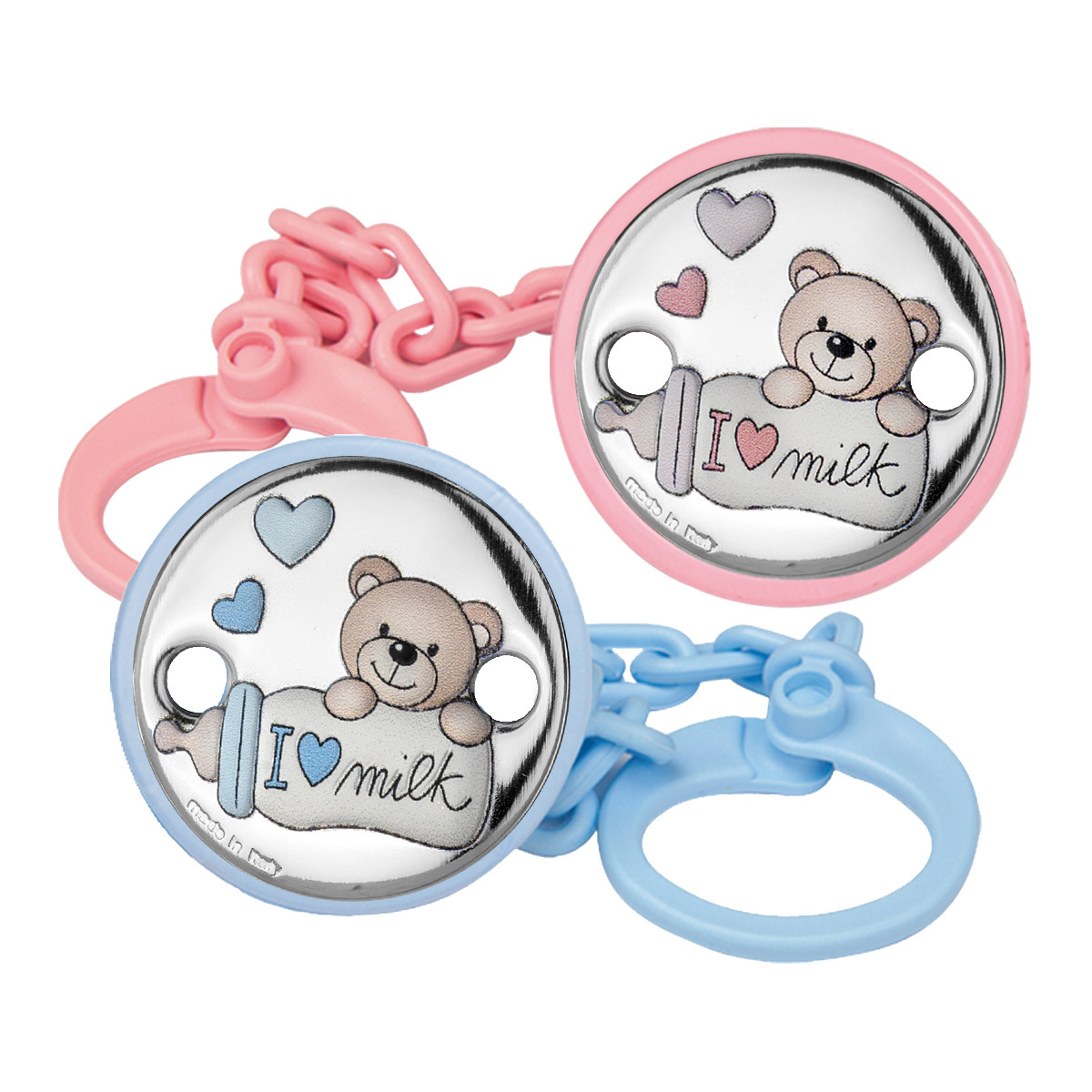 Chupetero oso y biberón en plata laminada. Disponible en color rosa y azul.