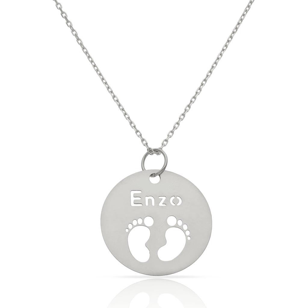 Colgante círculo con pies bebé personalizable con nombre calado en oro primera ley. Terminación brillo.