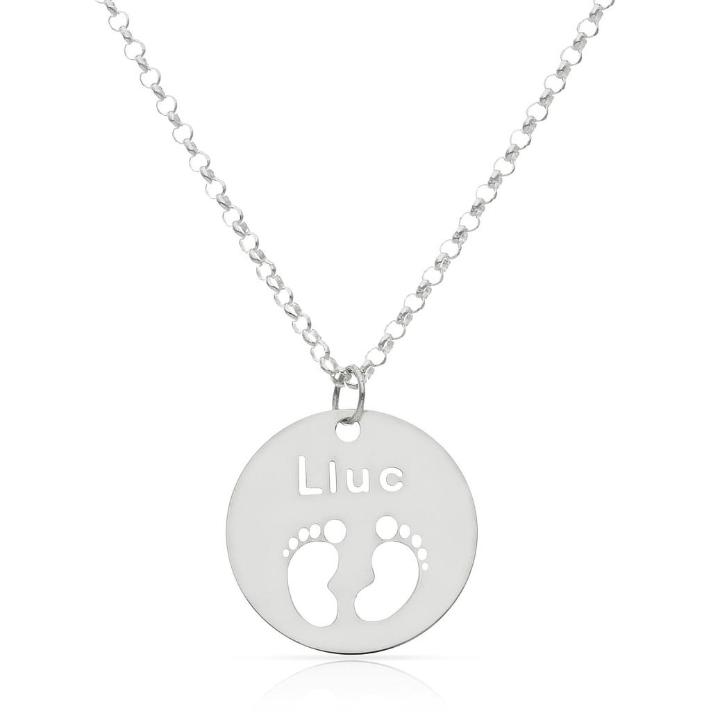 Emotivo y lleno de significado, este colgante redondo está elaborado en plata de primera ley con terminación en brillo. Su diseño incorpora el nombre personalizado junto a unos pies calados, símbolo perfecto de amor y ternura, ideal para mamás o como recuerdo de un nacimiento.