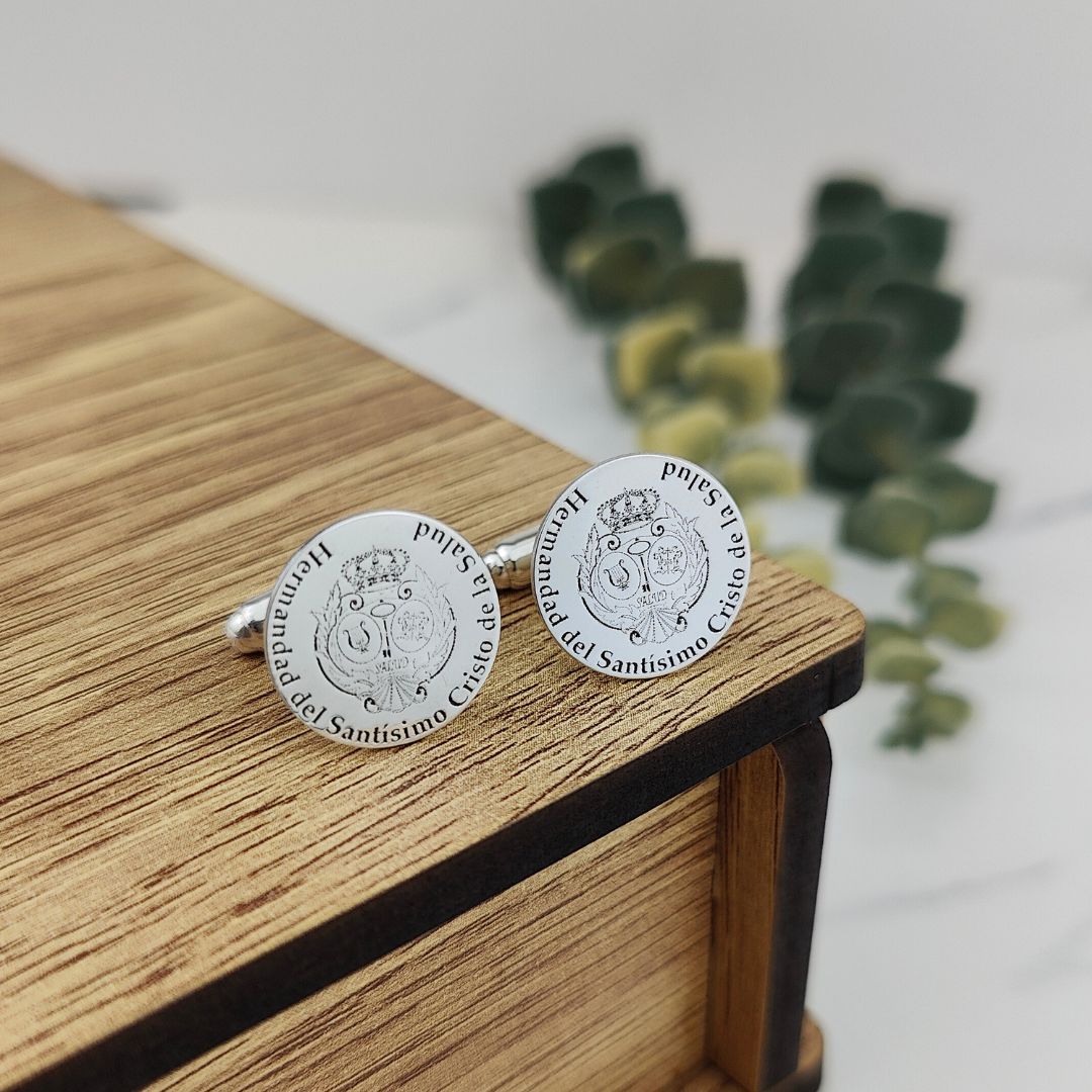 Gemelos redondos personalizados en plata primera ley. Un detalle elegante y exclusivo.