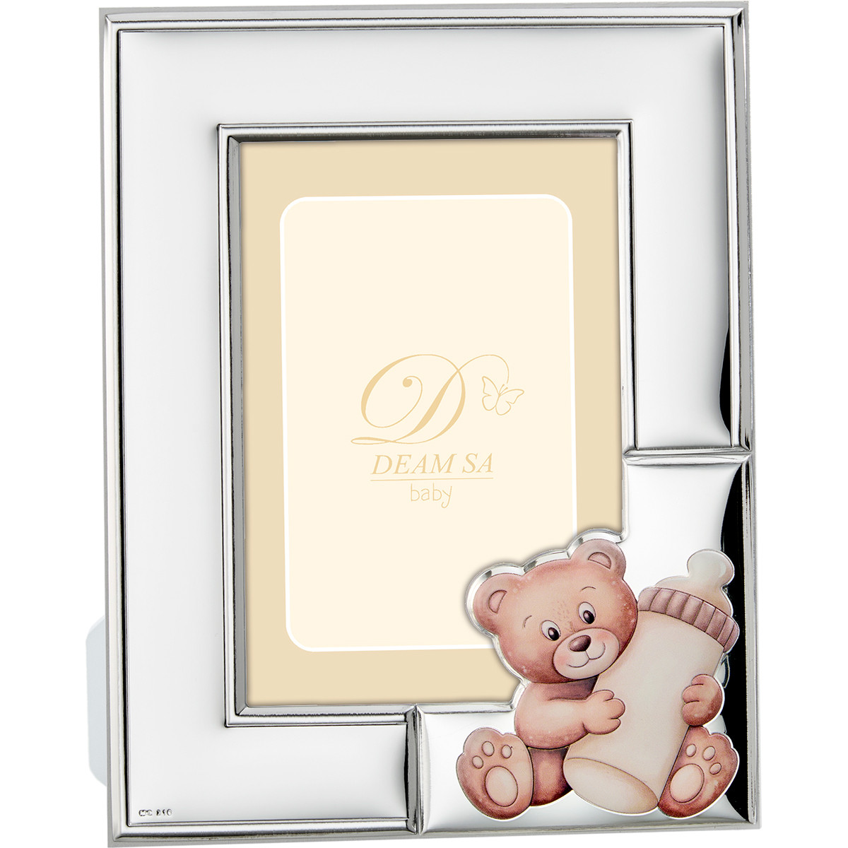 Marco infantil con dibujo oso y biberón en plata laminada.