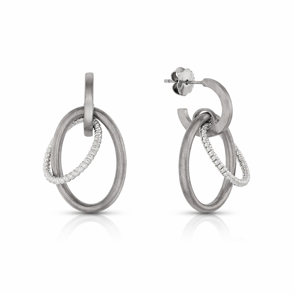 Modernos y sofisticados, estos pendientes en plata de primera ley combinan diseño contemporáneo y contraste de acabados. Su estructura de óvalos entrelazados une un aro de acabado pavonado negro mate con un segundo óvalo diamantado en brillo, aportando un delicado juego de luces y texturas.