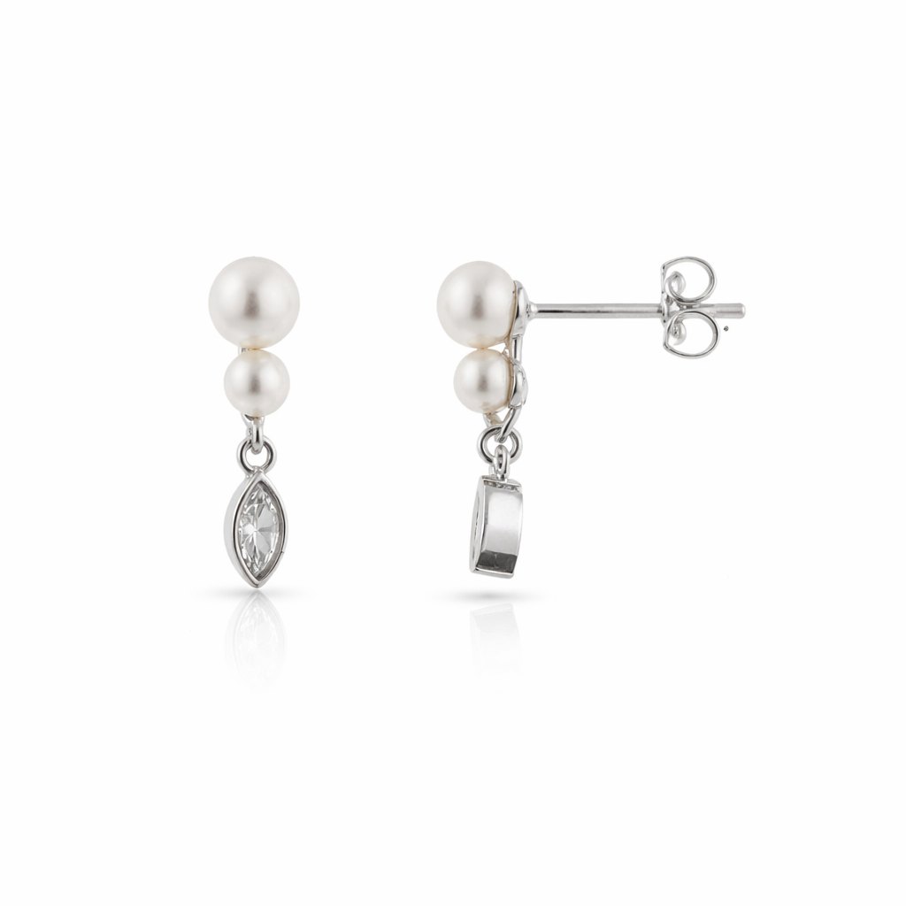 Elegantes y delicados, estos pendientes en plata de primera ley rodiada combinan la suavidad de dos perlas redondas con el brillo sofisticado de una circonita talla marquesa. Una pieza armoniosa que aporta luz y distinción a cualquier look.
