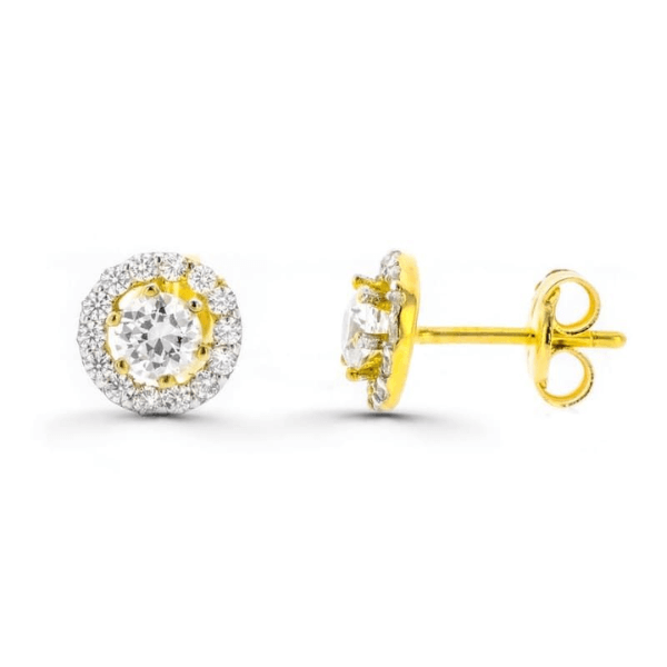 Pendientes roseta circonitas en oro amarillo primera ley. Circonita central en seis garras rodeada por un halo de circonitas.