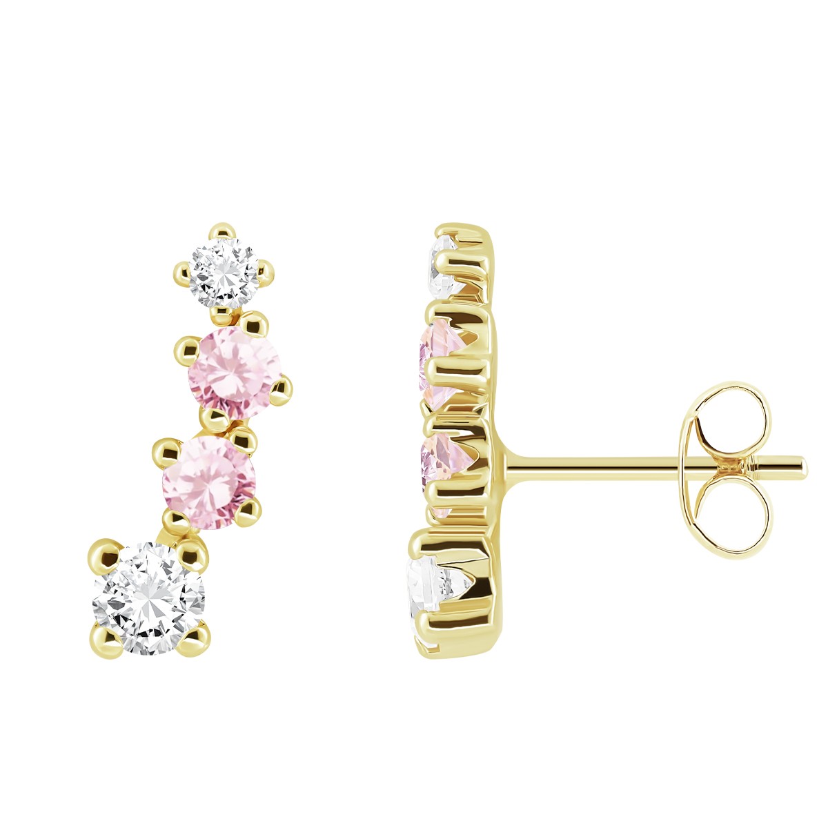 Delicados y llenos de encanto, estos pendientes trepadores en oro amarillo de primera ley combinan el brillo clásico de las circonitas blancas con la dulzura de las circonitas rosas, creando una composición armoniosa y femenina. Su diseño ascendente se adapta elegantemente al lóbulo, aportando un efecto estilizado y moderno que realza la mirada con un sutil toque de color.