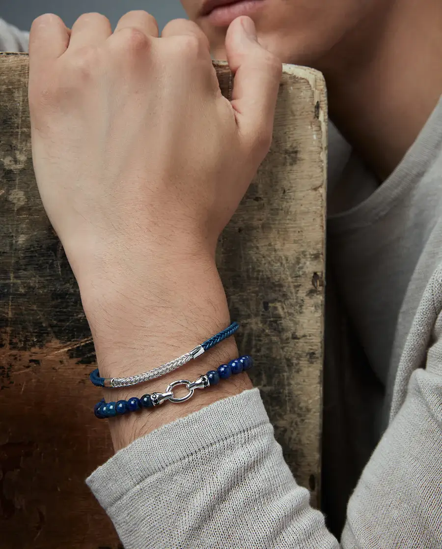 Una pulsera que combina la elegancia de la plata con la suavidad de la piel en un diseño moderno y masculino. Fabricada en plata de primera ley con baño de rodio, esta pieza presenta detalles de piel azul que aportan un toque de frescura y distinción. Su combinación de materiales le da un contraste único entre lo moderno y lo clásico. Con un largo de 19,5 cm más 3 cm de extensión, se ajusta cómodamente a la muñeca, brindando versatilidad y estilo.